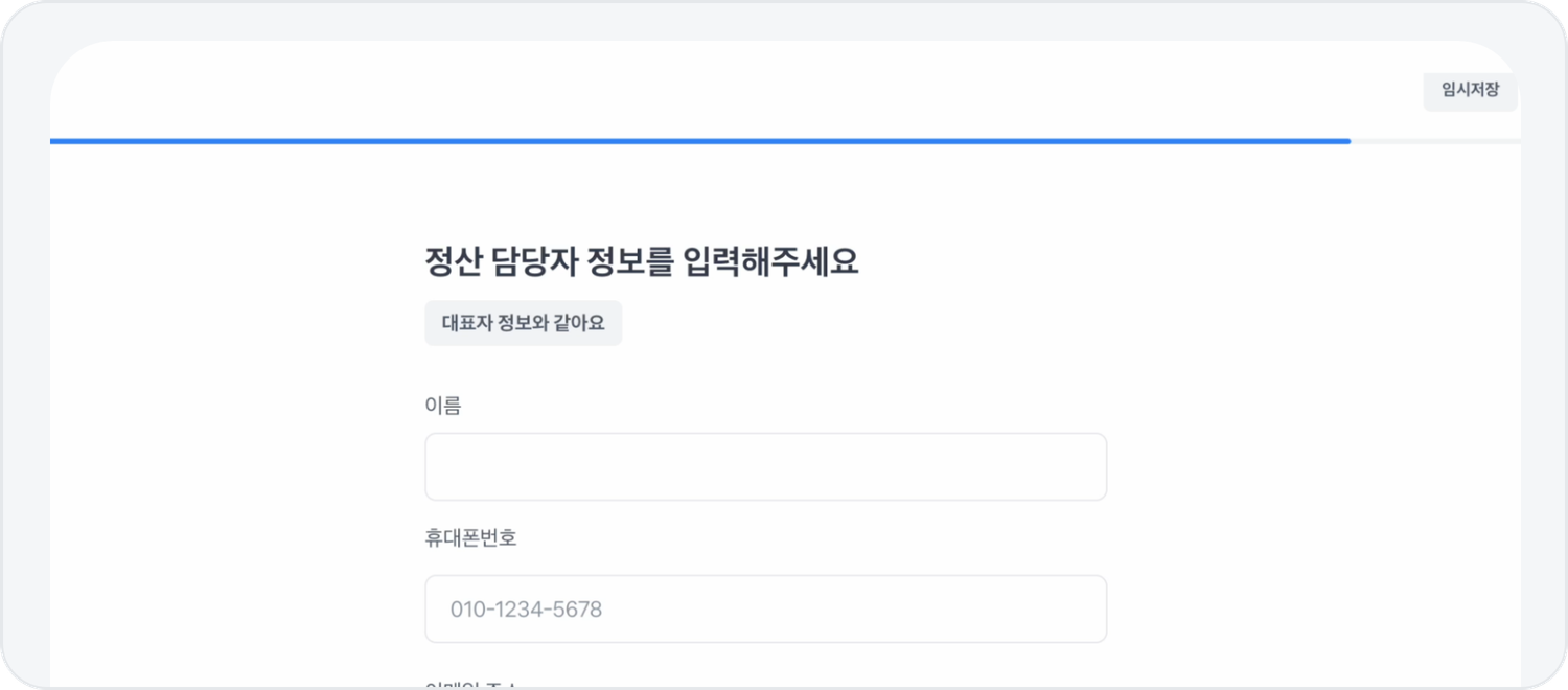 **`대표자 정보와 같아요`를 누르면 대표자 정보로 자동으로 채워져요**\