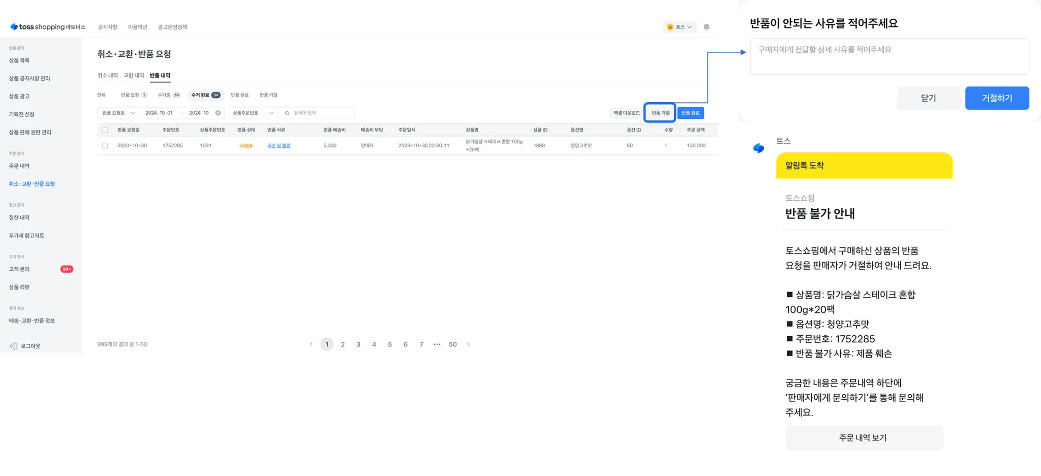 경로 : 토스쇼핑 파트너스→ 취소·교환·반품 요청 → 반품 내역→ 반품거절