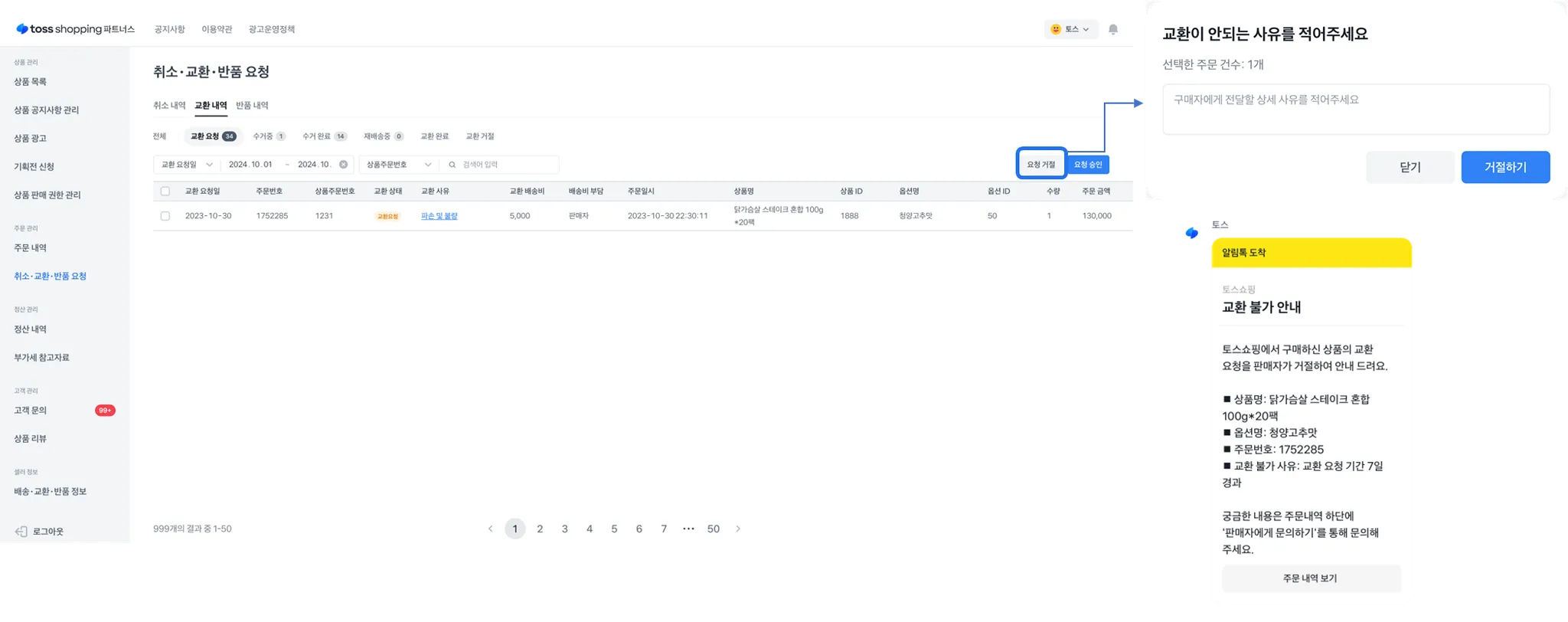 경로 : 토스쇼핑 파트너스 → 취소·교환·반품 요청 → 교환내역→ 교환 요청 → 단건/다건 주문건 선택 후 [요청 거절]