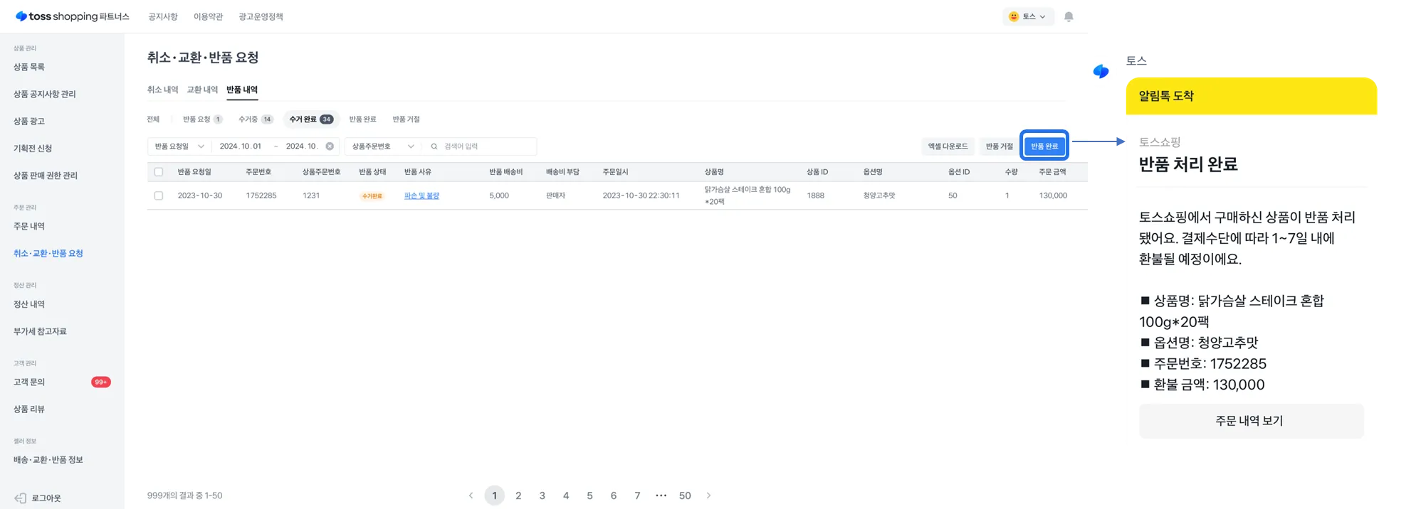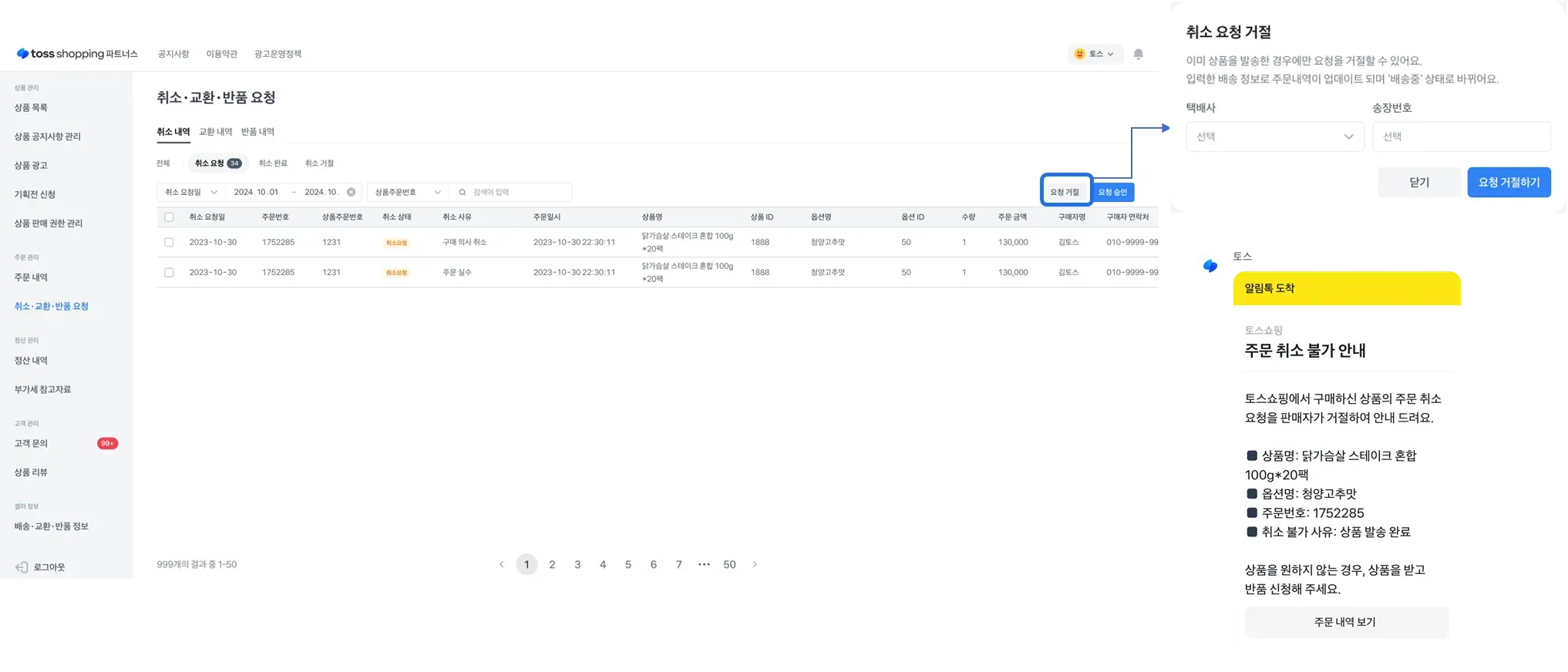 토스쇼핑 파트너스에서 취소, 교환, 반품 요청을 확인하고 관리하는 방법입니다.