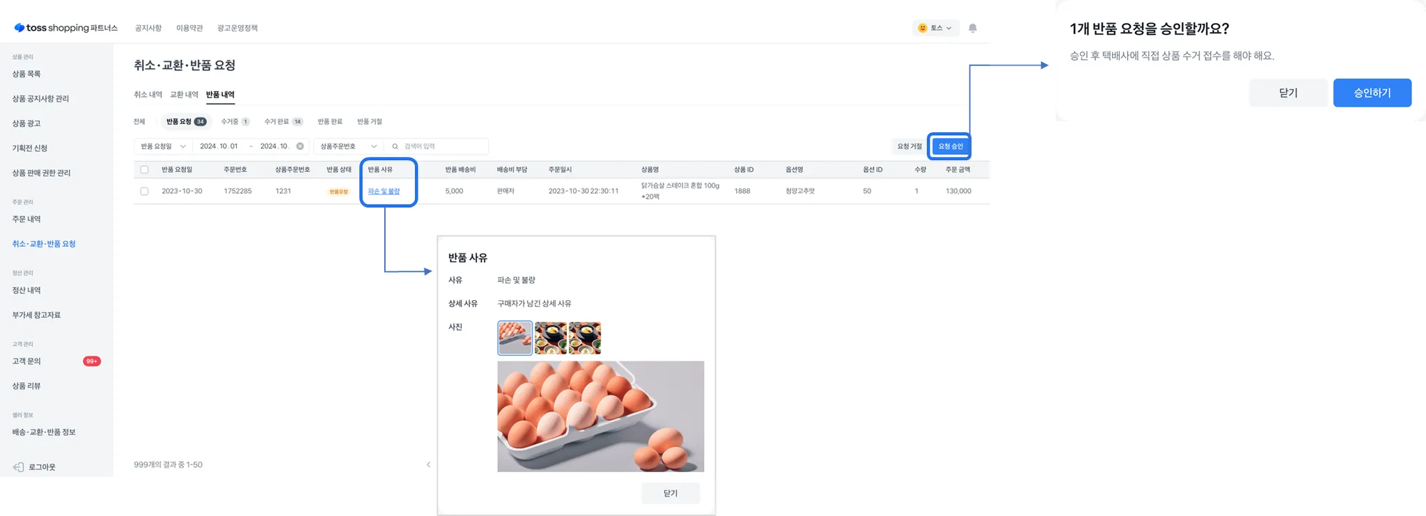 경로 : 토스쇼핑 파트너스 → 취소·교환·반품 요청 → 반품내역→ 반품 요청 → 주문건 선택 후 [요청 승인]