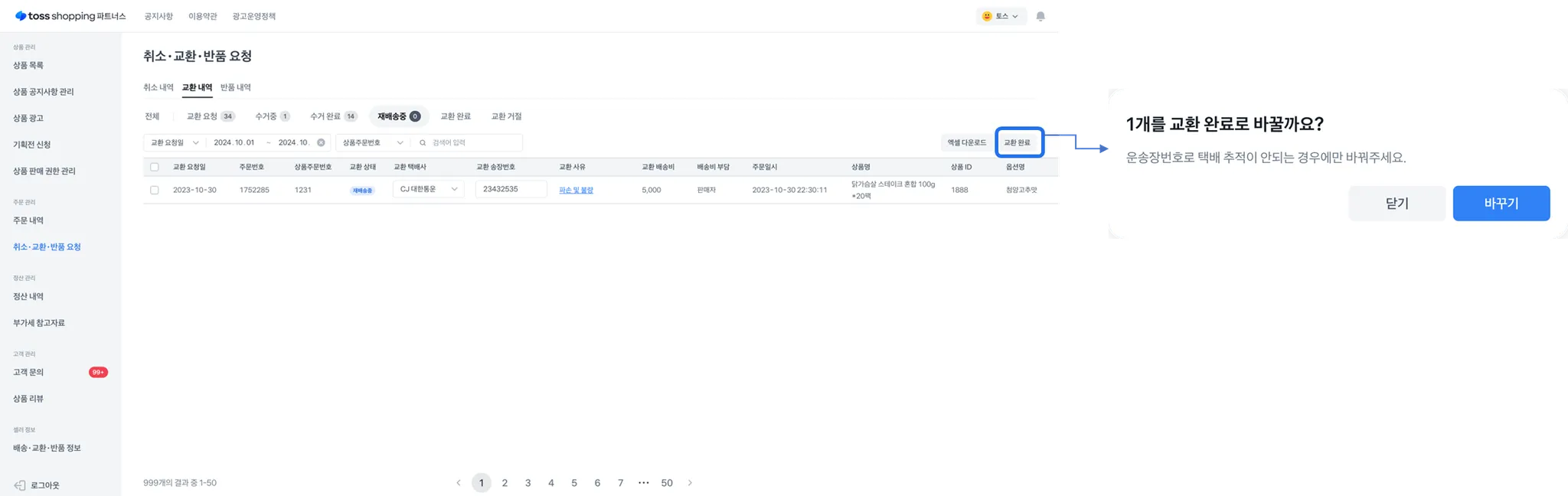 경로 : 토스쇼핑 파트너스→ 취소·교환·반품 요청 → 재배송중→ 교환완료