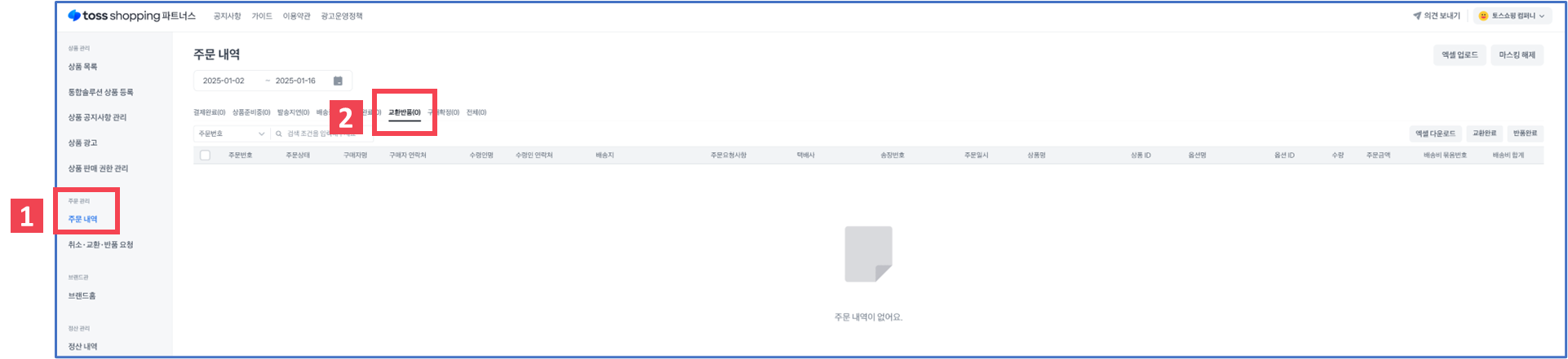 경로 : 토스쇼핑 파트너스 → 주문관리 → 주문내역 → [교환·반품]