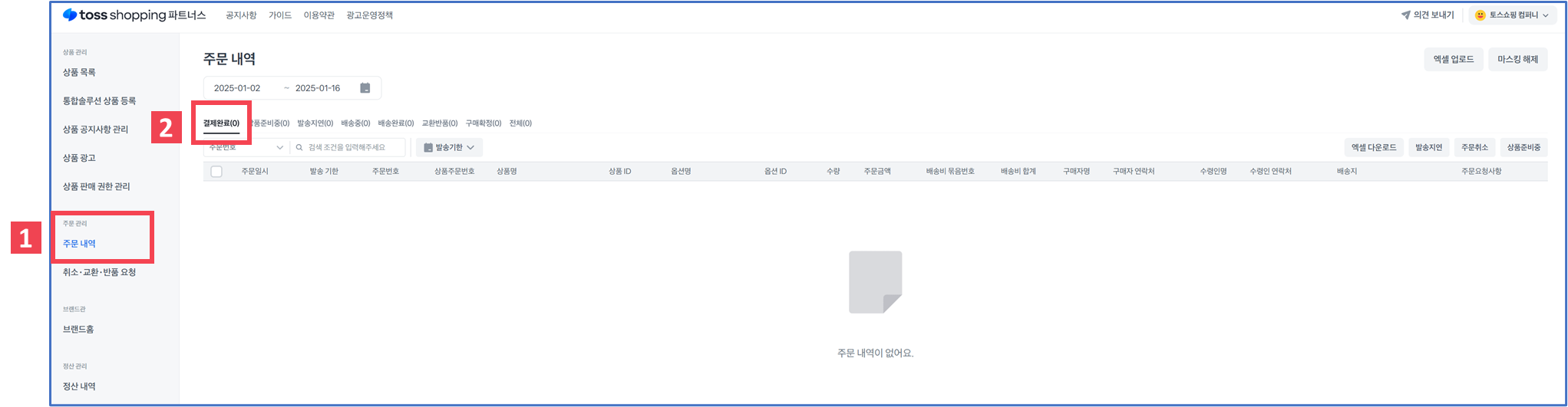 경로 : 토스쇼핑 파트너스 → 주문관리 → 주문내역 → [결제완료]