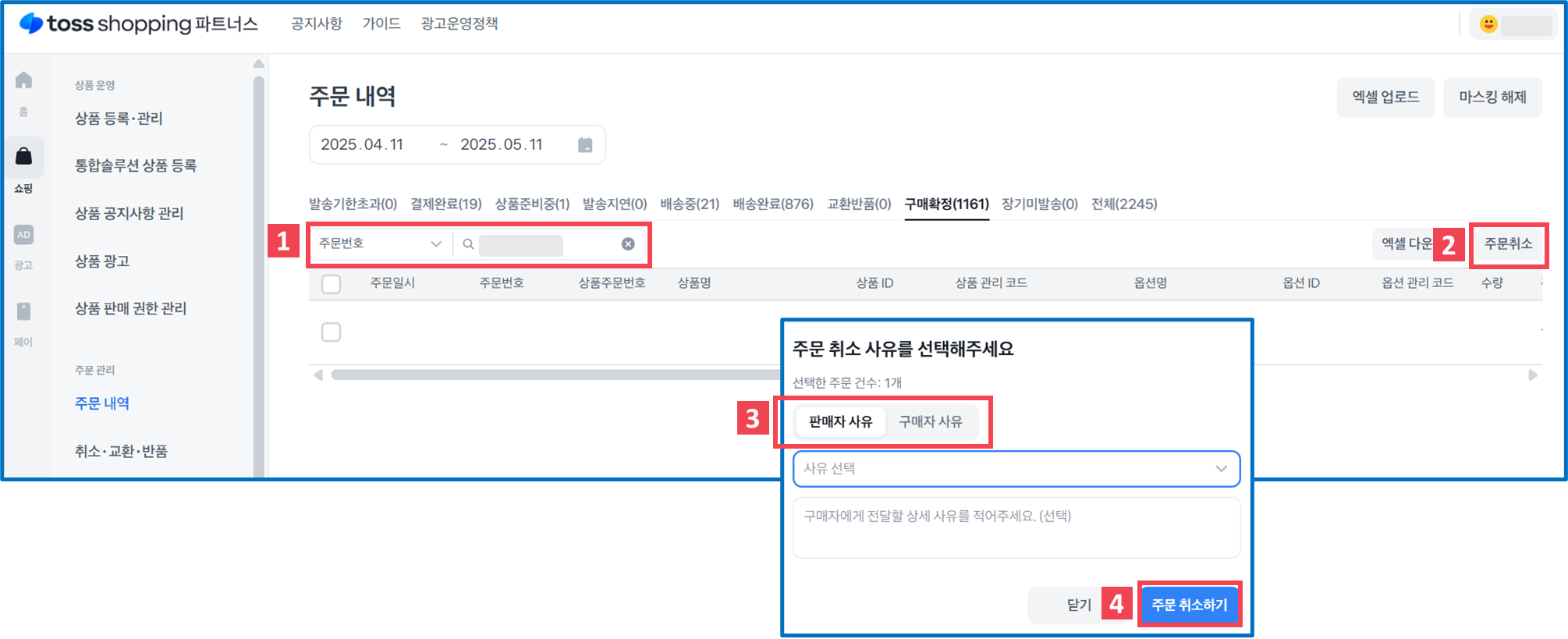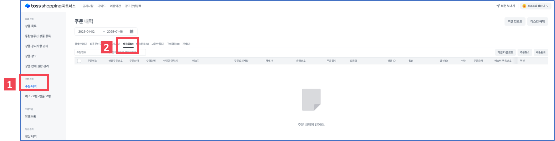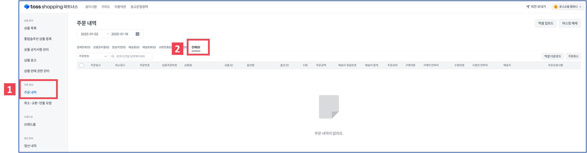 경로 : 토스쇼핑 파트너스 → 주문관리 → 주문내역 → [전체]