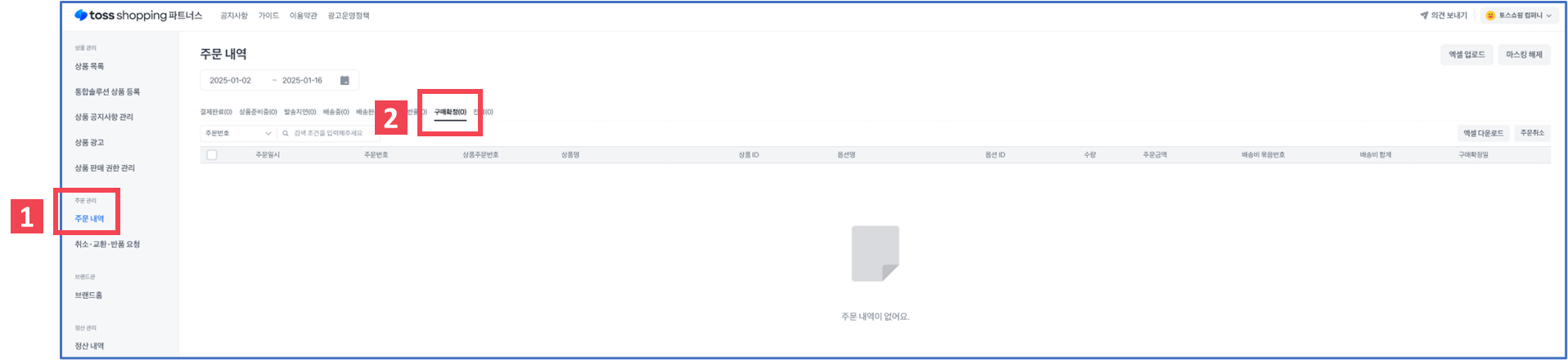 경로 : 토스쇼핑 파트너스 → 주문관리 → 주문내역 → [구매확정]