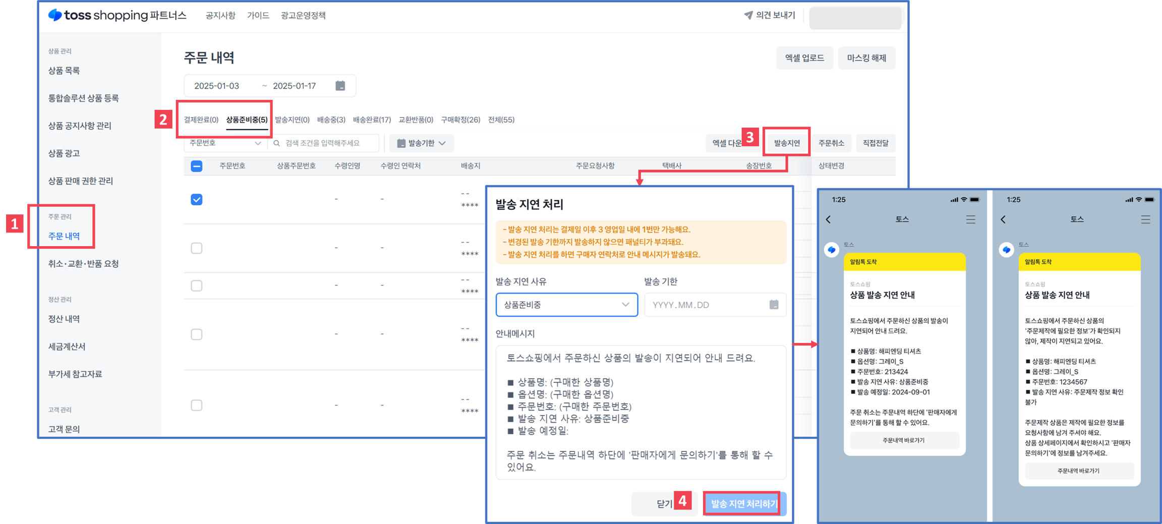 경로 : 토스쇼핑 파트너스 → 주문관리 → 주문내역 → [발송지연]