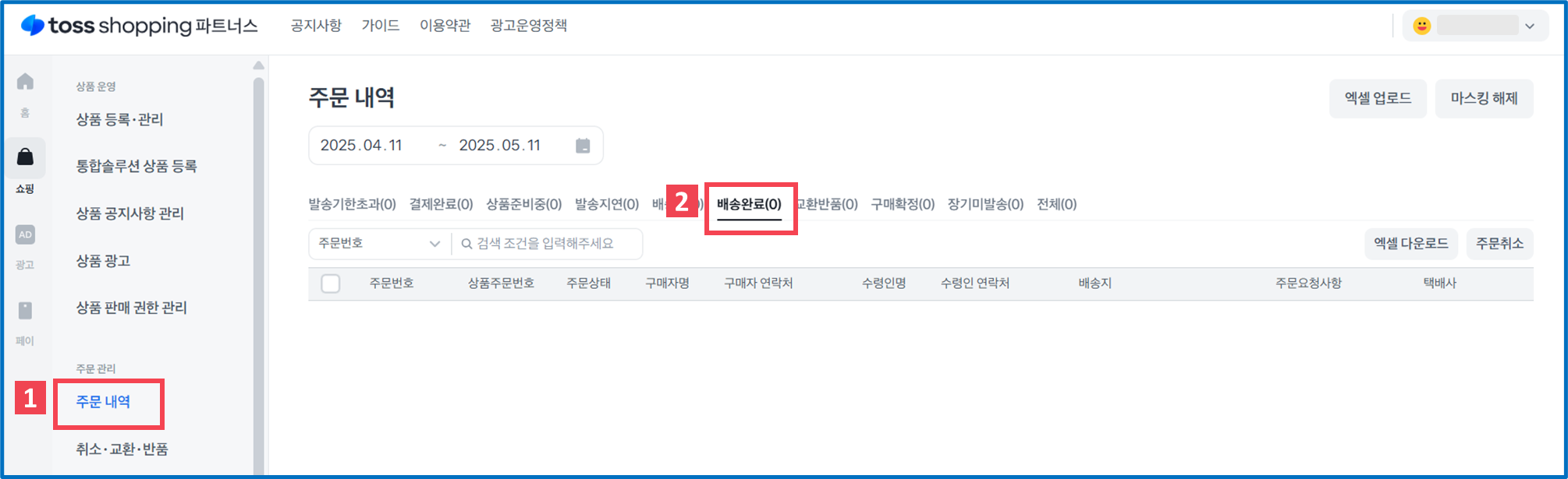 경로 : 토스쇼핑 파트너스 → 주문관리 → 주문내역 → [배송완료]