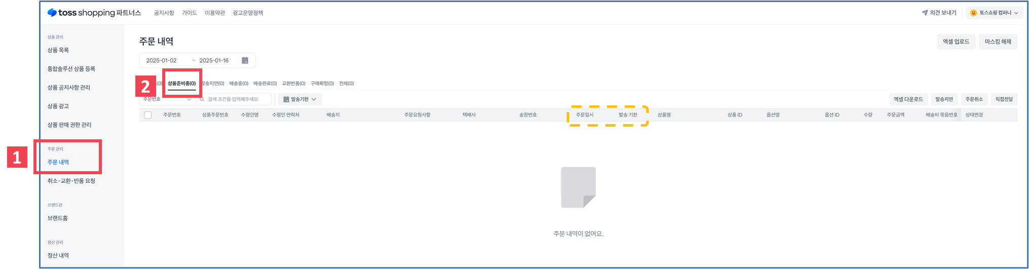 경로 : 토스쇼핑 파트너스 → 주문관리 → 주문내역 → [상품준비중]